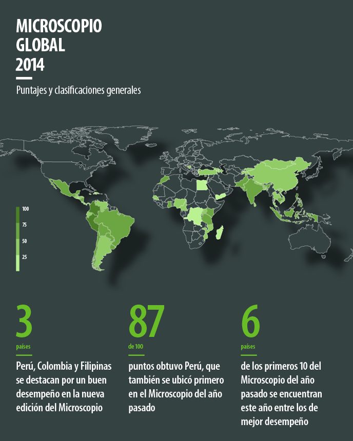 Por primera vez en sus ocho años de historia, el informe ha ampliado su enfoque más allá del ámbito de las microfinanzas, evaluando esta vez las condiciones y factores que apoyan la prestación de una amplia gama de servicios financieros de alta calidad. El Microscopio global 2014 incluye indicadores tales como apoyo gubernamental para la inclusión financiera, regulación para el crédito y el ahorro, sistemas de reporte de crédito, y medidas de protección para consumidores. El informe fue presentado hoy durante el Foro Interamericano de la Microempresa (Foromic), celebrado este año en Guayaquil, Ecuador.